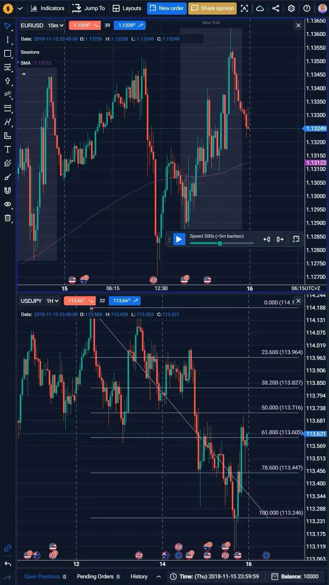 270개의 심볼에 대한 20년 이상의 틱 단위 데이터를 탐색하고, 다양한 시간대와 심볼에 걸쳐 최대 8개의 차트를 동기화하며, 전례 없는 백테스팅 정확도를 위해 초당 최대 하루까지 속도를 조정하세요.